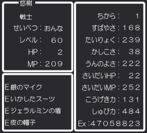 ………このステータスは絶対戦士じゃない。しかも武器がマイクて。何気にMPがそこそこあってHPが少なすぎるあたり、私は「歌って攻撃」なんでしょうね(笑)。