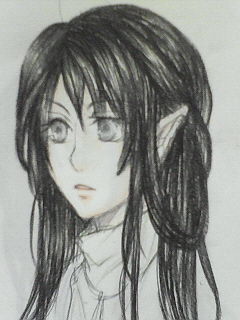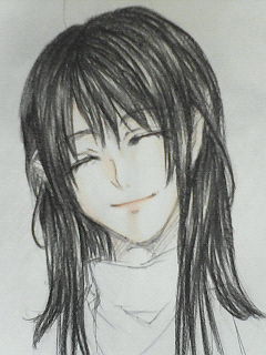 で、通常の後さらに髪型でモメて、後姿を絵師殿描いてみて「わからん…」とか呟く。それに頓着せず「今度は笑顔ー!」とかほざいて紙を押し付ける私。それで出来たのが「フィンウェスマイル」ですよナンですかこの美人で可愛い見事な笑顔。ノルドールのフィンウェさんのイメージの筆頭はこの笑顔だと信じてやみません(爆)。絶対こういうイメージだ、得してるんだか損してるんだか。ちなみに脳内で結構こういう表情しながら妙な台詞言ったりするから「白くて悪くて酷いひと」だとか思うんですよ私(救いがたいな…)。